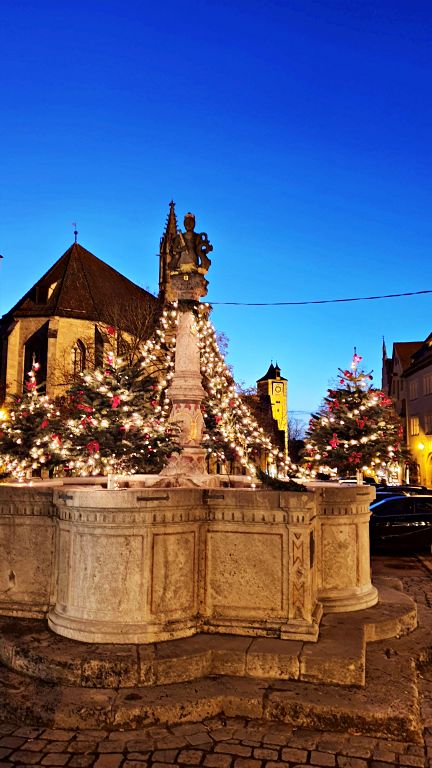 Assim que a noite cai e as luzes de Rothenburg se acendem, vale a pena caminhar novamente pelos pontos chave da cidade para revisitar as atrações com essa atmosfera ainda mais charmosa. No período do Natal, esse é o melhor momento para curtir os Mercados de Natal. Nas fotos abaixo estão a Marktplatz toda iluminada e a St. Georgs Brunnen (Fonte de São Jorge), maior fonte de Rothenburg, original de 1446.