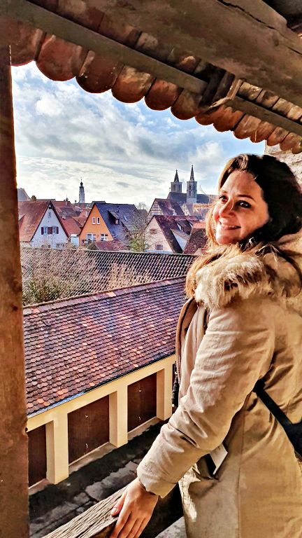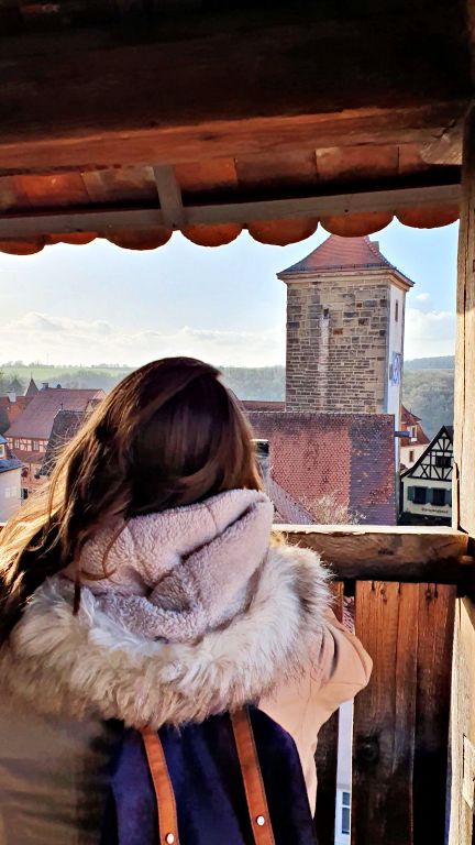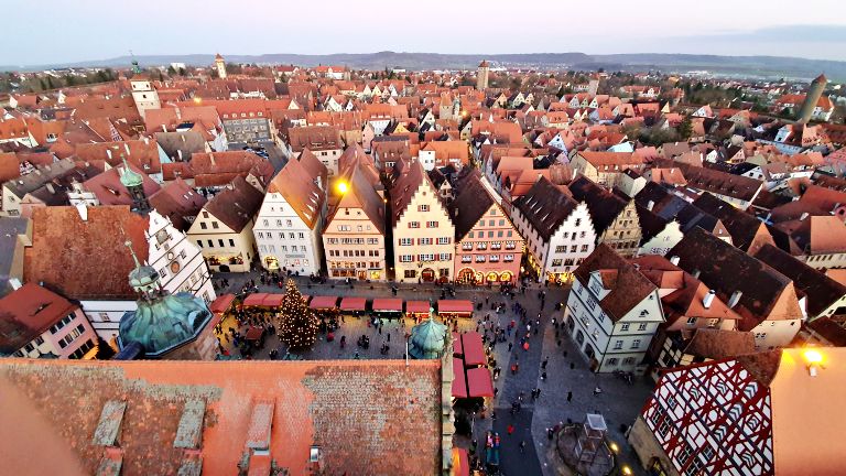 Uma das atrações mais legais de Rothenburg é justamente a subida em uma das torres da Prefeitura, a Rathausturm, de onde se tem um ponto de vista privilegiado para observar toda a cidade. Recomendamos essa atividade para o final da tarde, mais próximo ao horário do pôr do sol — e não precisa se preocupar em ter que andar muito para voltar até a Marktplatz, já que em Rothenburg ob der Tauber todos os caminhos levam até ela, e em qualquer roteiro pela cidade você acabará passando inúmeras vezes pela Marktplatz.