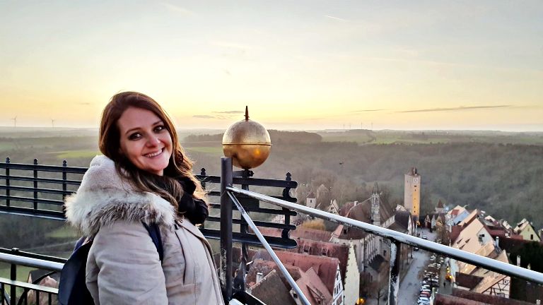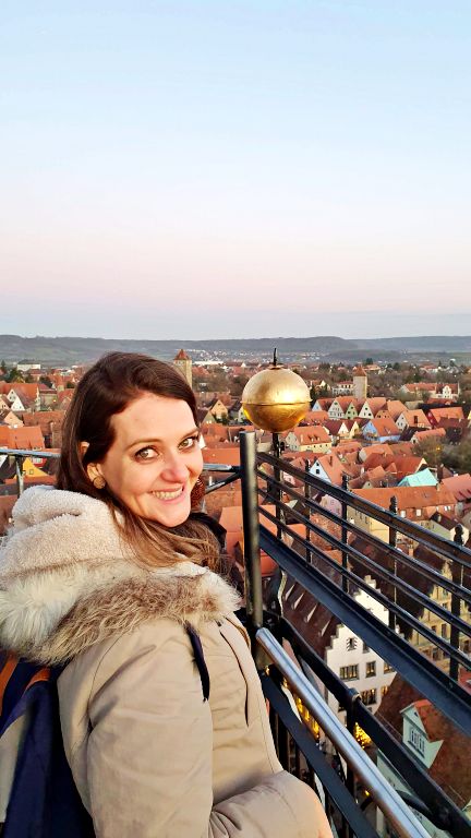 Alguns minutos antes do horário do pôr do sol é o momento ideal para outra atração concorridíssima da Marktplazt: a subida na Rathausturm, a torre da Prefeitura da cidade que mencionamos lá no início deste roteiro. Isso quando se trata de uma viagem no período do Natal, quando a atração funciona até as 19h00 e o sol costuma se por às 17h00. Dependendo da época da sua viagem, pode ser necessário subir a torre mais cedo — nos meses fora da alta temporada, a atração costuma funcionar apenas das 12h00 às 15h00. Não deixe de confirmar certinho no site oficial do turismo de Rothenburg para calcular o melhor momento para fazer a subida!