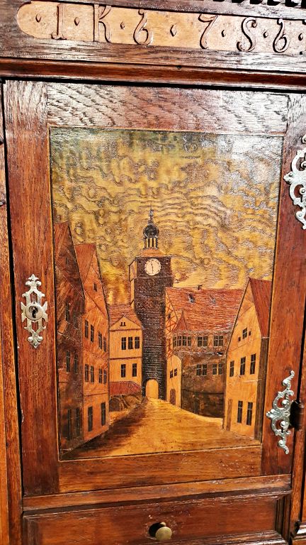 Reparem que na fachada do edifício aparecem em destaque alguns relógios: o mais antigo deles, com o fundo vermelho, data de 1683. Já o relógio astronômico (original de 1768) é um daqueles relógios que de hora em hora (das 10h00 as 22h00) apresentam bonequinhos em metal representando uma cena histórica da cidade. No caso de Rothenburg, a apresentação é sobre a lenda do “Meistertrunk” (Trago Magistral). Diz a história que durante a Guerra dos Trinta Anos (1631), o então prefeito de Rothenburg (Nusch) propôs uma aposta ao general imperial Tilly (que estava prestes a destruir a cidade): se conseguisse beber uma caneca de cerca de 3 litros de vinho da Francônia de uma só vez, Rothenburg seria poupada. Os bonequinhos do relógio astronômico representam essa história e mostram como o prefeito Nusch salvou a cidade da destruição.