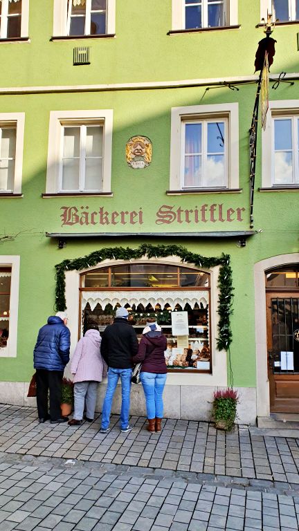 De volta a rua principal Schmiedgasse, a vitrine da simpática padaria Striffler (Bäckerei Striffler) costuma estar repleta de exemplares de um doce típico da região chamado “Schneebällen“. O doce consiste em uma grande bola de massa frita em óleo e bem crocante, que em sua versão mais tradicional é recoberta apenas por açúcar e canela, mas também pode ser encontrada com chocolate e outros confeitos.