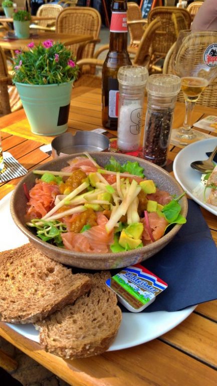 – Zalmsalade: salada de salmão defumado escocês, maçã verde, abacate e uma compota de pimenta amarelo