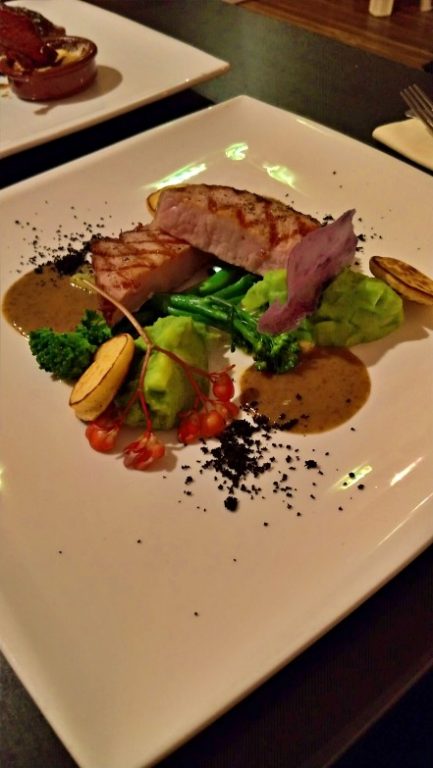 St. Hendrick suckling pig – batata blini (tipo um bolinho achatado, broccoli, purê de talo de brócoli (bimi), azeitona ralada, flor da macieira e purê de cogumelos