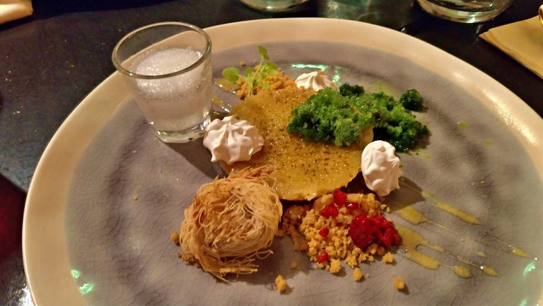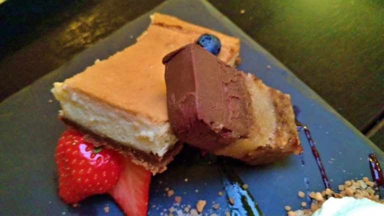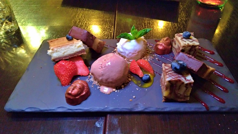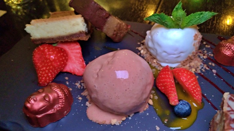 Mix de pequenas porções de todas as sobremesas da casa. Experimentamos sorvete de coco e de caramelo, cheesecake de chocolate branco e framboesa, bolo de mármore branco com nozes de macadâmia e chocolate e sorvete, bombom de café, mini bolo de chocolate com café, torta de chocolate com tâmaras e amêndoas.
