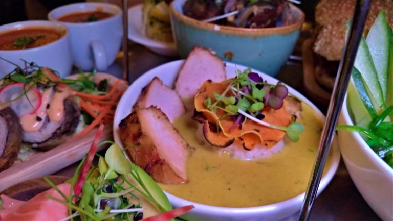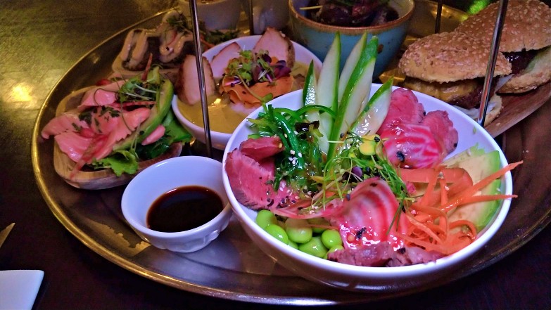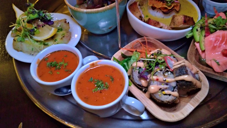Algumas das opções que experimentamos nesse prato: sopa de tomate com páprica, caril de frango tailandês, sushi de atum panko com salada de algas e maionese de pimenta, hambúrguer com cheddar e chutney de manga, pão brioche com humos de vários sabores, ceviche de salmão com salada de mamão fresca, agrião e beterraba chioggia, rosbife com salada e avocado, poke bowl de carne com de lombo fatiado, vôngole em vinho branco e alho frito.
