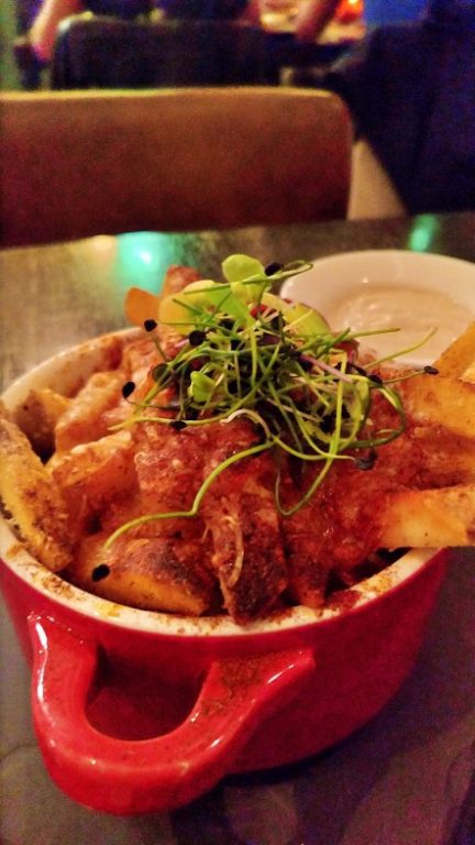 Batata frita gratinada com queijo e páprica picante e azeite trufado acompanhada de maionese trufada.