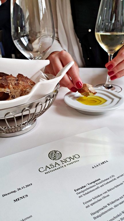 No cardápio, as especialidades da cozinha ibérica variam de acordo com a época do ano e a criatividade do Chef, e é possível optar tanto pelo pedido dos prato “à la carte” (em média entre CHF 25 a CHF 40) quanto pelos menus de passos (a partir de CHF 70 um menu de 3 passos com entrada, prato principal e sobremesa). É muito provável que os pratos disponíveis na ocasião da sua visita não sejam exatamente os mesmos que nós experimentamos e apresentaremos a seguir. Mas acredito que as fotos e impressões ajudarão a dar uma bela ideia sobre a proposta do restaurante e a qualidade de toda a experiência. Fique tranquilo para confiar nas recomendações da equipe, afinal, não é a toa que o Casa Novo é considerado uma “joia” de Berna por boa parte dos críticos e já recebeu diversas premiações dos principais guias gastronômicos.