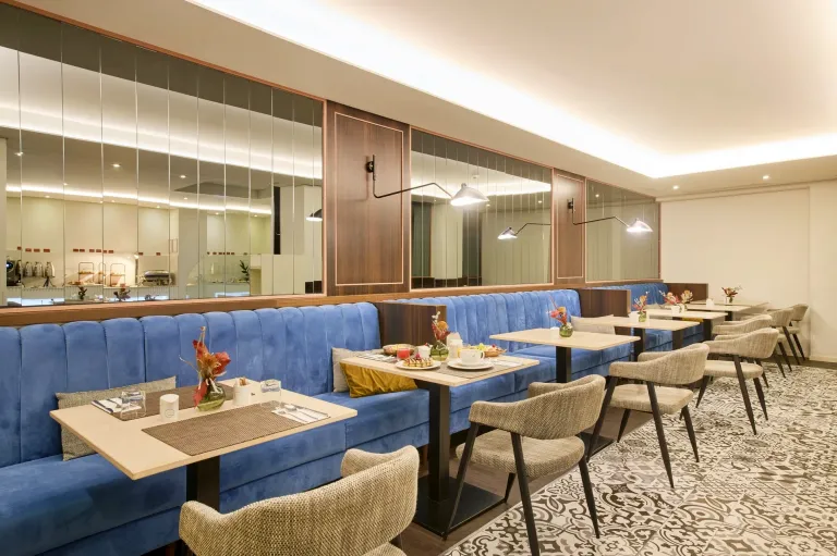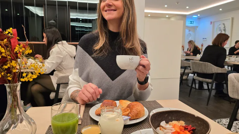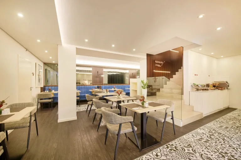 O café da manhã é um dos pontos altos para quem se hospeda no Hotel Moon & Sun Porto. Tudo começa no elegante salão do andar abaixo da recepção, um ambiente tranquilo e perfeito para iniciar o seu dia com o pé direito.
