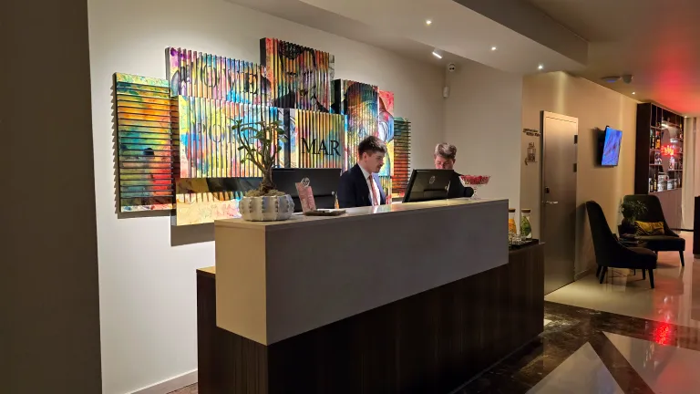 A recepção / lobby segue a linha contemporânea, e o atendimento merece destaque especial — não apenas no momento do check-in, mas ao longo de toda a estadia, o pessoal da recepção sempre nos atendeu com simpatia e com muitas dicas sobre o que fazer na cidade.