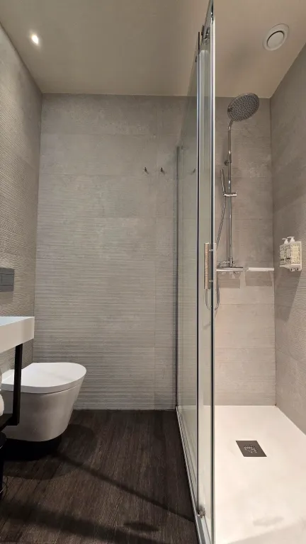 O banheiro segue o mesmo padrão do quarto e do hotel: moderno, bem decorado, e aparentando estar perfeitamente limpo e bem conservado. Apesar de não muito amplo, o espaço é bem aproveitado e conta com uma bancada com pia e espelhos, secador de cabelos e bons produtos de higiene, além de um chuveiro com ótima pressão e controle de temperatura.
