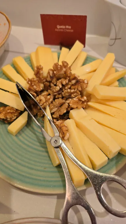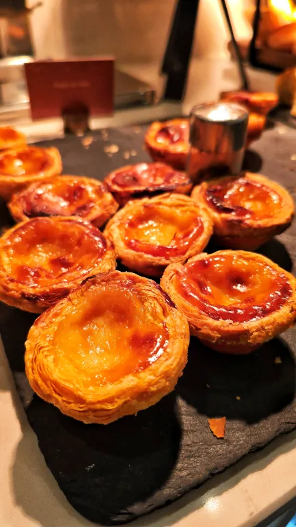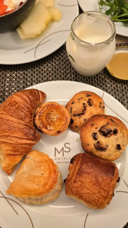 O que não poderia faltar é o clássico Pastel de Nata, uma instituição portuguesa que a maioria dos bons hotéis fazem questão de oferecer para os hóspedes. Em uma das manhãs de nossa estadia, chegamos a pegar os pastéis de nata ainda quentes, saindo do forno — uma delícia! Mas além do tradicional doce português, há também bolos que variam todos os dias.