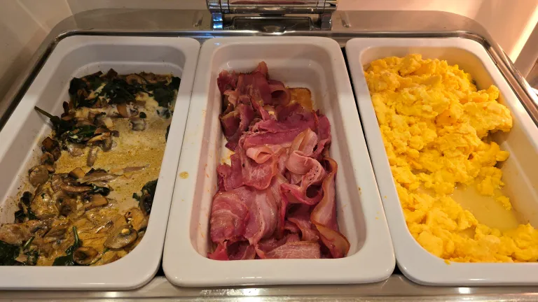 No setor de comidas quentes, os clássicos ovos mexidos e bacon recebem a ilustre companhia de cogumelos salteados ao molho de creme — prato que estava simplesmente espetacular!