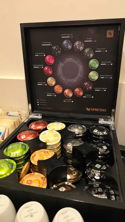 Como não ficar feliz ao encontrar no quarto uma Máquina de café Nespresso com cápsulas de cortesia (4 cápsulas cortesia por quarto para todo o período da estadia) e uma chaleira elétrica com sachês de chá? O quarto ainda conta com geladeira frigobar, que nem sempre está presente nos hotéis portugueses e é uma boa pedida para quem gosta de fazer compras em supermercado para ter snacks e bebidas no quarto durante a estadia.
