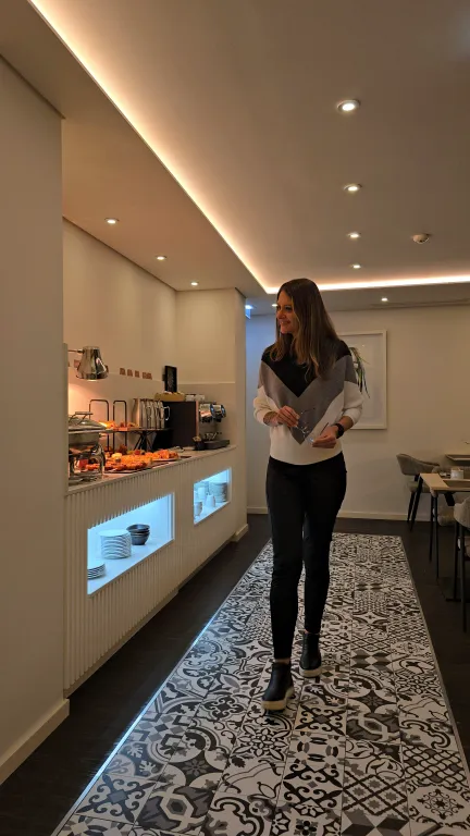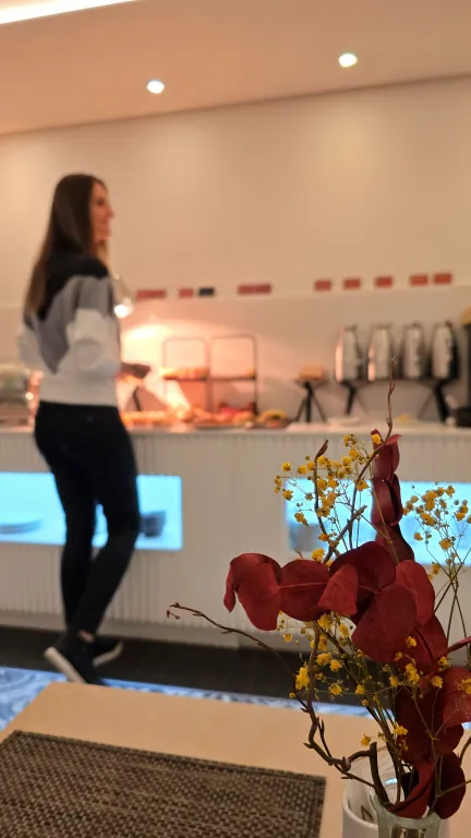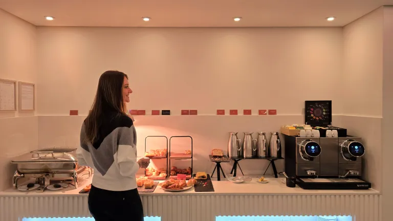 Outro diferencial simpático do Hotel Moon & Sun Porto é o lanche da tarde oferecido gratuitamente aos hóspedes, servido diariamente das 14h às 19h. No salão onde acontece o café da manhã, são disponibilizados café fresco, chás e alguns itens previamente servidos no buffet de café da manhã (em quantidade reduzida), como pães, pastéis de nata, croissants e bolos. A proposta é simples, mas funcional: um agrado para quem retorna de um passeio ou precisa de algo leve antes do jantar.