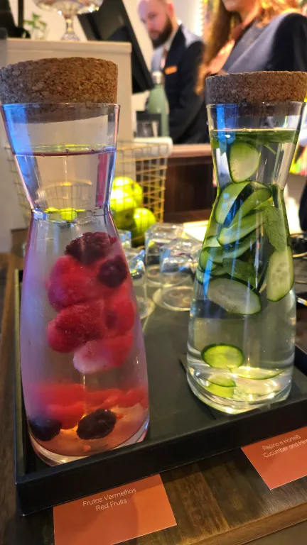 Ainda no check-in, aquela surpresa simpática que todo viajante adora: cada hóspede tem direito a um welcome drink, podendo escolher entre vinho do Porto ou espumante, servido no bar do hotel a qualquer momento da estadia. No check-out, o “mimo” oferecido foi um pacote de biscoitos caseiros. E durante todo o dia, a recepção conta com garrafas de água saborizada a disposição do hóspede. Gestos que reforçam o cuidado com a experiência do cliente