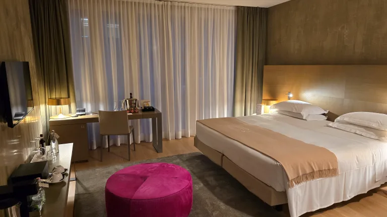 Em nossa estadia, optamos pelo quarto duplo Grand Deluxe, que mesmo sendo das categorias de entrada, é mais do que suficiente para uma ótima experiência de hospedagem em Milão. Até porque todas as acomodações, mesmo as de menor preço, são amplas e equipadas com comodidades modernas, incluindo cama espaçosa, máquina de café expresso, TVs de tela plana, Wi-Fi gratuito e banheiros com amenities de alto padrão. A maior parte dos quartes possuem vista para ruas históricas ou para a própria Piazza Fontana, e todos são decorados em estilo moderno com toques de sofisticação, como os acabamentos em mármore italiano dos banheiros ou os tecidos refinados das roupas de cama e jogos de toalhas.