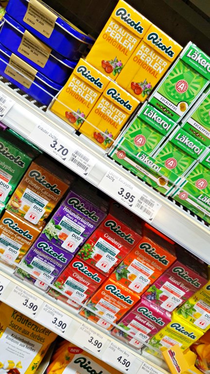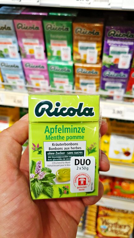 A Ricola é uma balinha à base de ervas locais super tradicional e fabricada na Suíça. Ou melhor, balas não, “pastilhas”, já que supostamente a Ricola tem funções medicinais, auxiliando no combate a tosse, rouquidão, mal hálito e até mesmo reforçando o sistema imunológico. Se é verdade, não sabemos. Mas o fato é que a Ricola pode ser encontrada em diversos sabores e cada pacote com duas caixinhas de 50 gramas custa de 3CHF a 4CHF.