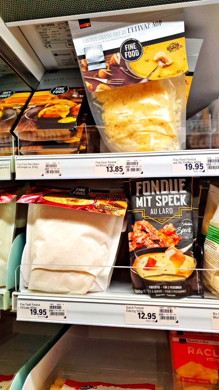Entre os pratos mais tradicionais da cozinha local estão a Raclette (tradicional queijo raclette derretido e servido com pão, batatas ou conservas) e o clássico Fondue de queijo. Ambos estão a venda nos supermercados na Suíça e são uma ótima sugestão para trazer de viagem e relembrar o gostinho da culinária suíça já de volta ao Brasil. Os pacotes são bem compactos e fáceis de acondicionar na mala de viagem, e os preços variam bastante de acordo com a marca escolhida.