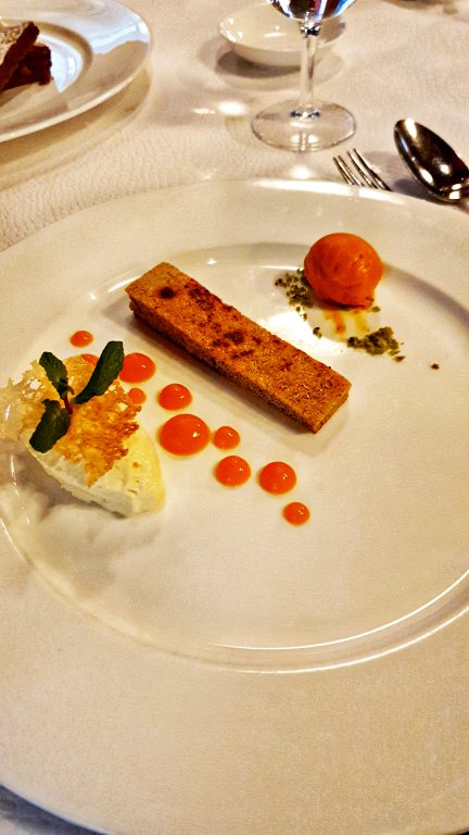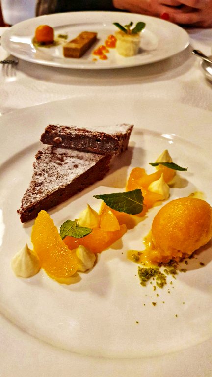 Passo 4: Para encerrar, as sobremesas. A primeira, uma torta de chocolate amargo com tangerina e frutas cítricas em diferentes preparos e texturas. A segunda tinha inspirações natalinas por conta da época do ano e trazia sabores de especiarias típicas dos Mercados de Natal.