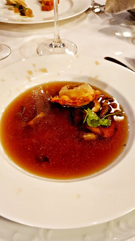 Passo 1: Foram servidas duas entradas diferentes, um imperdível Mousse de fígado de pato natural com cebola roxa confit, pérolas de maçã, Beldroega e pão branco salteado e um Consomé com cogumelos selvagens assados e legumes escalfados com ravioli frito recheado com rabada, daqueles que aquecem o corpo e a alma. Tudo perfeitamente harmonizado com um vinho branco Mettaz Petit Arvine 2017
