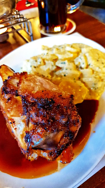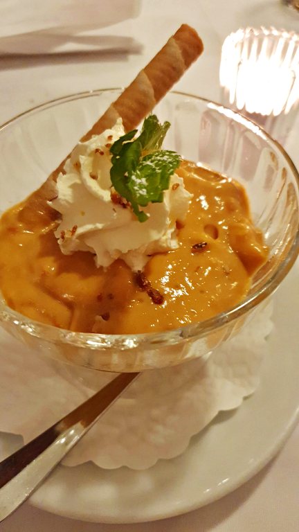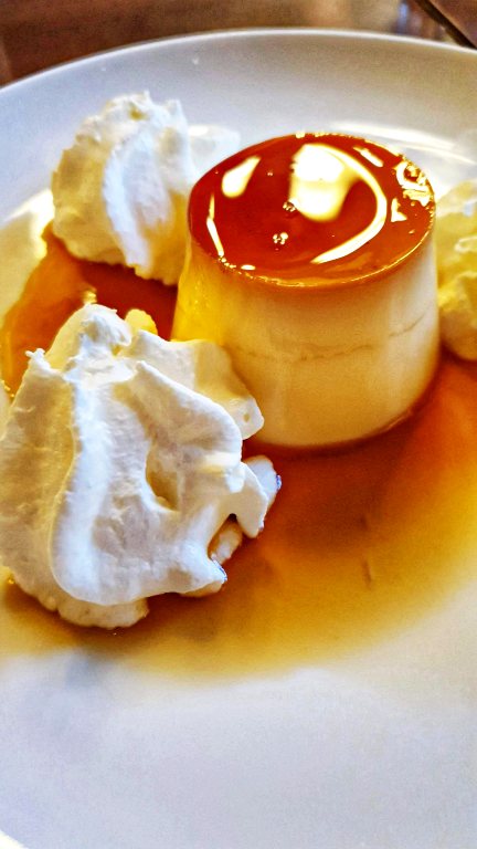 De sobremesa, além das opções tradicionais da cidade como o pudim de caramelo com chantilly (caramelköpfli) ou a torta de maçã (apfelstrudel), o cardápio sazonal costuma oferecer boas opções como a que pedimos: Gebrannte Crème – creme de caramelo com especiarias e chantilly. Ao final, duas cervejas, dois pratos principais e uma sobremesa para dividir foram o suficiente para nós dois.