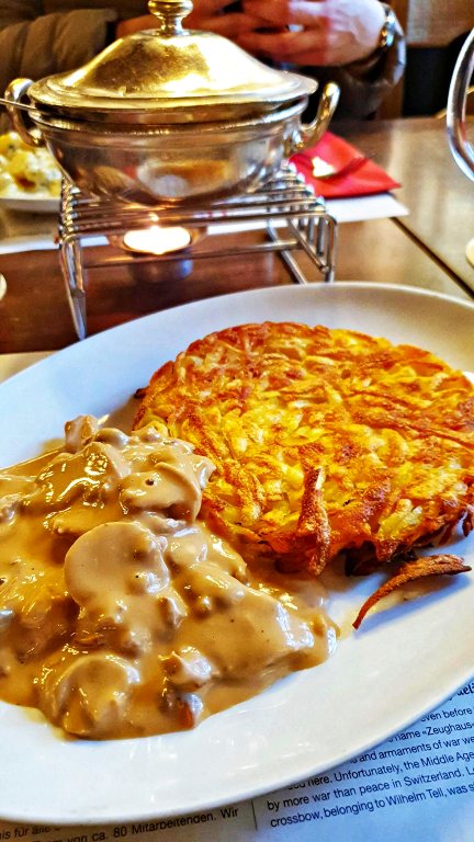 Quando falamos em comida típica de Zurique, engana-se quem pensou em fondue ou raclette. Sim, até existem restaurantes na cidade especializados nos pratos à base de queijo tão populares no imaginário que temos da cozinha Suíça. Mas em Zurique os pratos típicos em geral tem a carne como principal elemento. Desde as tradicionais salsichas (como a original Zürcher Kalbsbratwurst), passando pelas carnes empanadas comuns em outras partes da Europa como o Schnitzel e o Cordon bleu até chegar aos pratos realmente históricos da cidade: o Kutteln Zürcherart (tripas de boi fatiadas e cozidas em molho de vinho branco) e o mais famoso deles, o Zürcher Geschnetzeltes (uma espécie de estrogonofe com finas fatias de carne e champignons acompanhado de batata rösti).