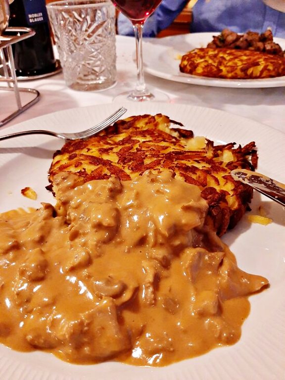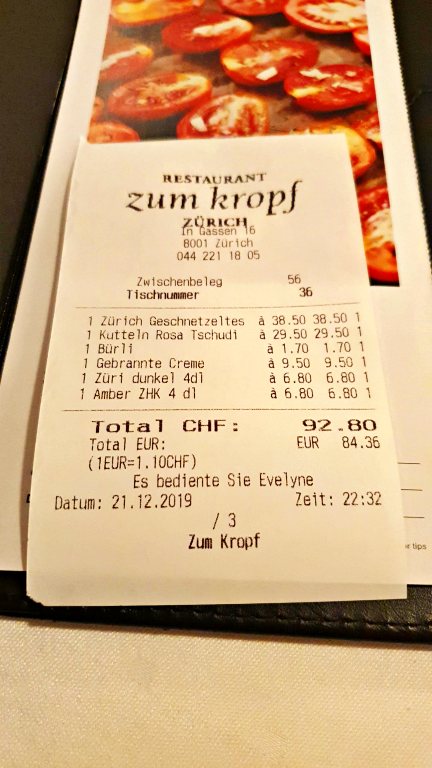 O que pedir no Zum Kropf: O cardápio regular traz especialidades e clássicos da cozinha regional, mas o restaurante sempre conta com um menu adicional que muda regularmente e acrescenta algumas especialidades sazonais às opções. Mas em qualquer restaurante tradicional de Zurique é quase impossível resistir a tentação de pedir como um dos pratos o Geschnetzeltes Kalbfleisch Zürcherart acompanhado de batata rösti. Esse é o tipo de prato que não tem erro, será bem servido em praticamente qualquer lugar de Zurique. Já a nossa segunda pedida como prato principal foi bem mais ousada: decidimos experimentar o Kutteln Zürcherart – o prato regional a base de tripas de boi fatiadas e cozidas em molho de vinho branco ou tomate. O detalhe é que a própria atendente se surpreendeu com a nossa ousadia – segundo ela, é um prato que os mais antigos da cidade adoram mas que os jovens não criaram o hábito de comer. Fica a sugestão para quem quiser um prato típico mas desafiador.