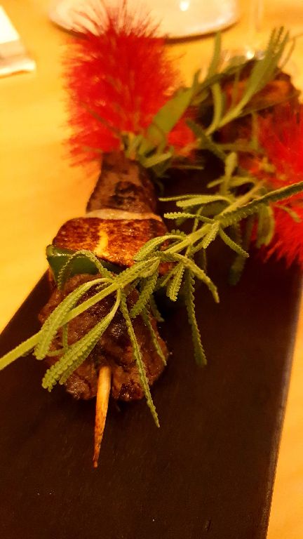 A nossa experiência no Boaz Cozinha e Bar foi a junção de dois conceitos que a gente ama: culinária sofisticada e comida típica da região. A sofisticação e a criatividade do jovem Chef William Williges se traduz em seus pratos super inventivos inspirados na culinária tradicional do Rio Grande do Sul. E o melhor: as releituras criativas de alguns dos clássicos são ainda elaboradas com ingredientes locais que enaltecem a cultura e a variedade de produtos que a região oferece. Um exemplo é uma frutinha silvestre que é muito comum RS chamada “araçá”, mas que no restante do Brasil quase não se vê. Essa aí estava no ketchup que acompanhou os dadinhos de tapioca da entradinha e me fez voltar a infância só de ouvir o nome! Também experimentamos de entrada o Xixo do Boaz, um espetinho de alcatra, queijo coalho, pimentão e cebola pérola assados na brasa.