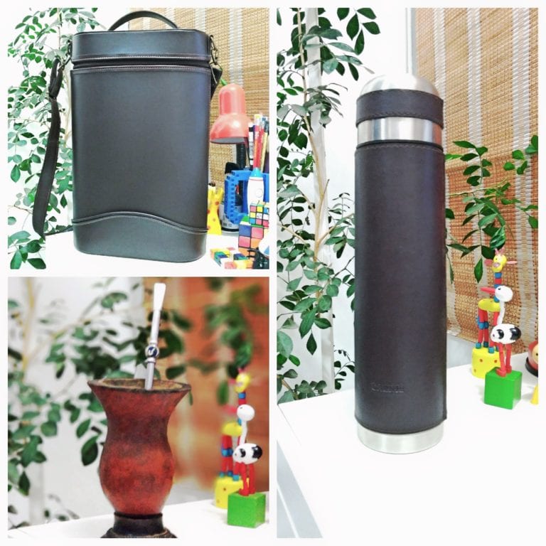 Para carregar todos os apetrechos do mate existe uma “bolsa” ou suporte especial, em geral feita de couro, ao qual chamamos de “mateira”. Essa aí da foto é meu xodó! Um kit do modelo uruguaio todo de couro e bem compacto, comprado na viagem para Montevideo e Colônia de Sacramento.