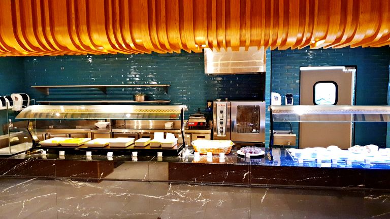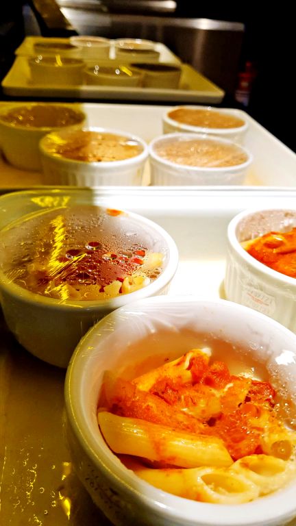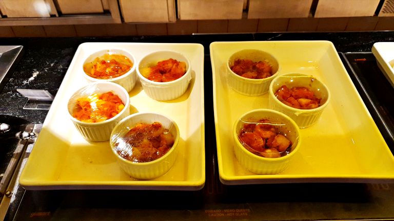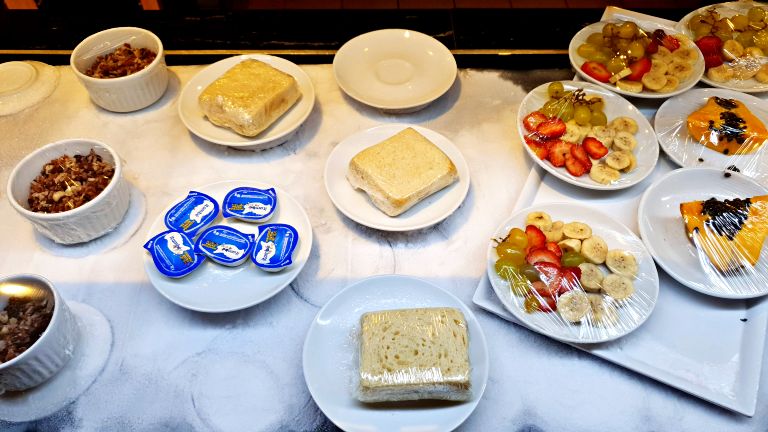 Em nossa visita mais recente (próximo ao horário do jantar), haviam pequenas porções individuais de massa (penne ao sugo), frango à moda thai e estrogonofe, além de uma opção de salgadinho e pães de queijo. Apesar de embalados individualmente, ficamos surpresos em como tudo era mantido bem quentinho, mesmo em um horário de menor movimento da sala vip. A reposição era constante e garantia que tudo estivesse super fresco. Destaque também para a embalagem individual de cada porção, seguindo os protocolos sanitários. Gostamos especialmente do estrogonofe e dos pães de queijo recém assados.