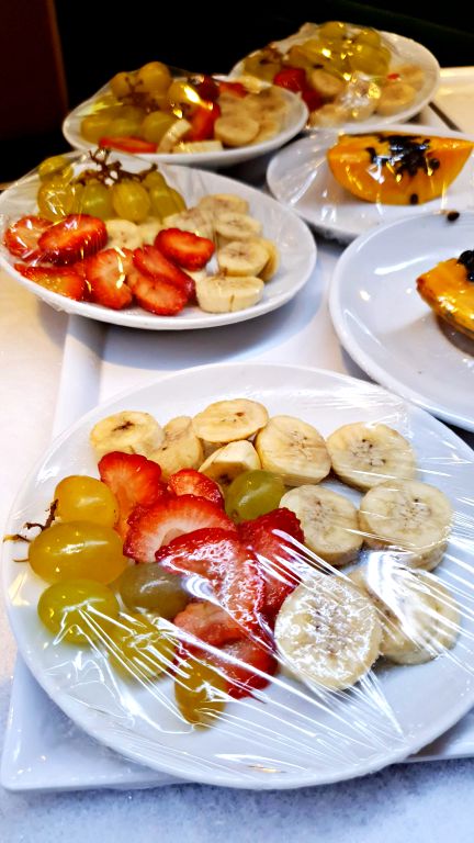 Ao lado das comidas quentes, pratos bem completos de frutas porcionadas (também embalados um a um) além de sanduiches frios, iogurtes, cereais e alguns doces.