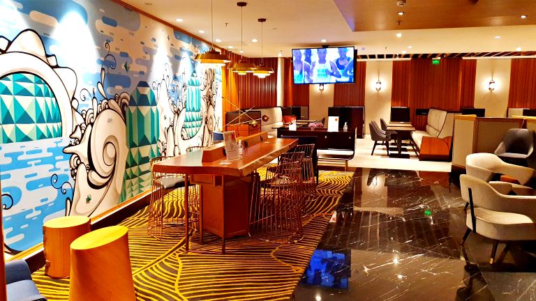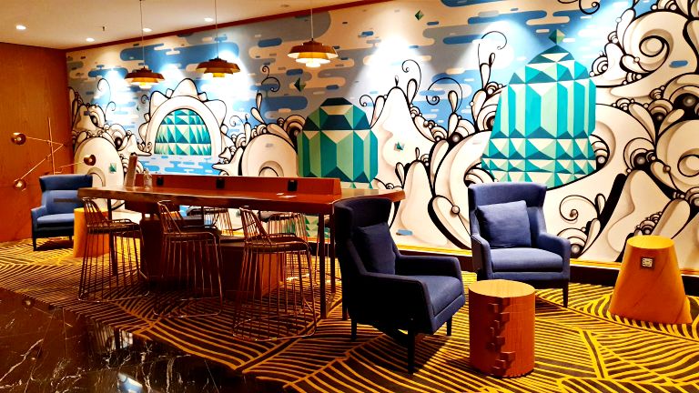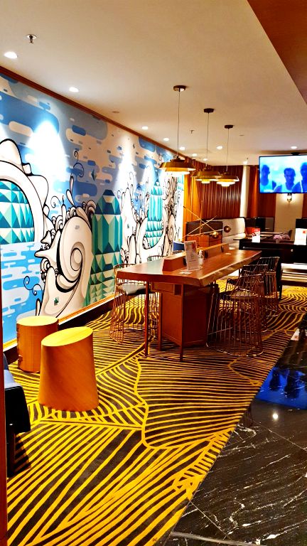 O ambiente é amplo e tem decoração moderna e bem colorida, desde o grafismo da estampa do carpete até as ilustrações remetendo a arte de rua em uma das paredes principais. Os detalhes em madeira das mesas e de boa parte do ambiente ajudam a deixar a sala um pouco mais aconchegante. Lembra bastante o padrão de um lobby de hotel de estilo business/executivo.