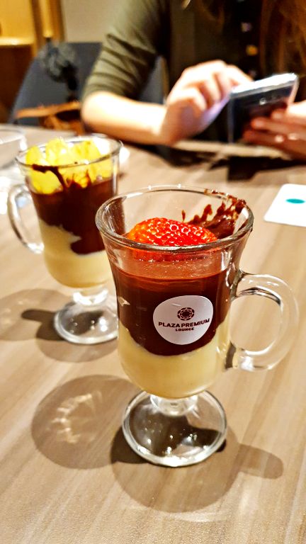 E para completar a experiência com chave de ouro, enquanto terminávamos os últimos pães de queijo e experimentávamos o bolinho de frutas vermelhas com o nosso cappuccino preparado na hora, a equipe da sala vip trouxe de surpresa uma sobremesa preparada na hora para nós: essa xícara da última foto do bloco abaixo, que vinha com um creme inglês, calda de chocolate quente e morango fresco. Além de muito saborosa, ponto positivo pela iniciativa e pela surpresa que adoramos! 🙂